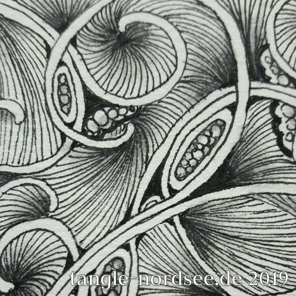 Die Bilder müssen nichts Bestimmtes darstellen. Zu Beginn weiss man nicht, welches Bild entstehen wird, man hat keine feste Vorstellung im Kopf. Das ist sehr befreiend und entspannend. Klassisch wird mit einem schwarzen Fineliner auf ein 9x9 Zentimeter grosses, weisses Kärtchen (Tile) gezeichnet und dann mit Bleistift schattiert.