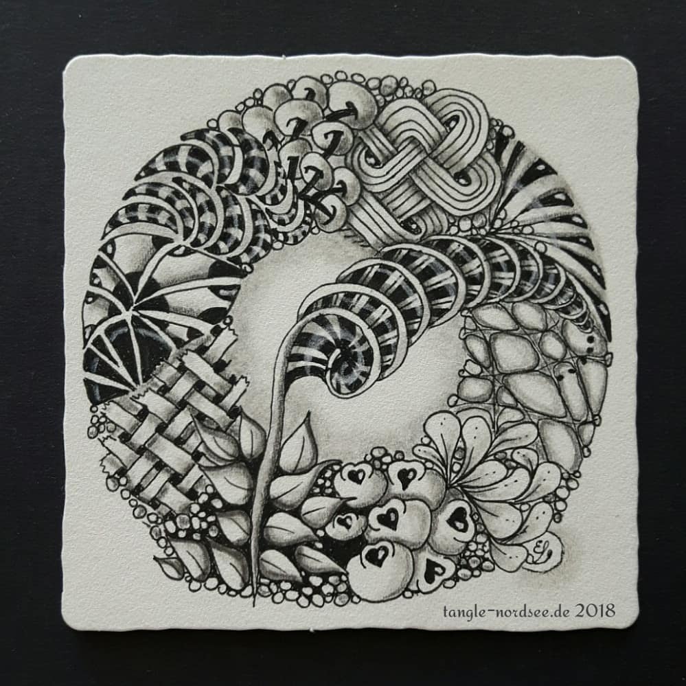 Zentangle® ist ein zusammengesetztes Wort aus „Zen“ (Entspannung/Meditation) und „Tangle“ (Verschlingung). Mit Hilfe der Zentangle®-Methode zeichnet man strukturierte Muster und gestaltet damit graphische Bilder, die einen dreidimensionalen Charakter haben. Diese Methode ist einfach und kann ohne Vor-kenntnisse angewendet werden.