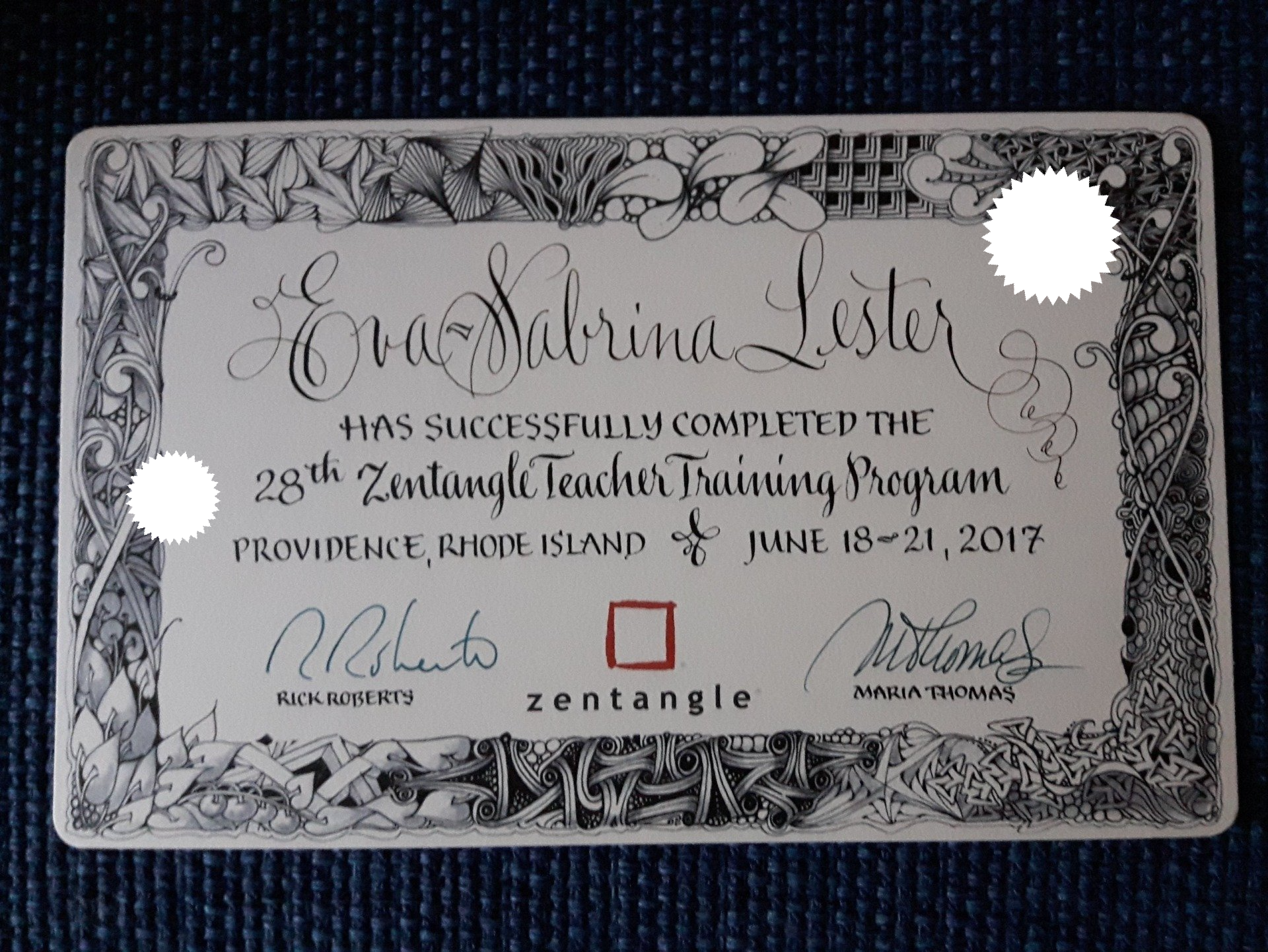 Durch mein in Providence USA erworbenes Zertifikat darf ich auch hier in Deutschland die Zentangle® Methode unterrichten.